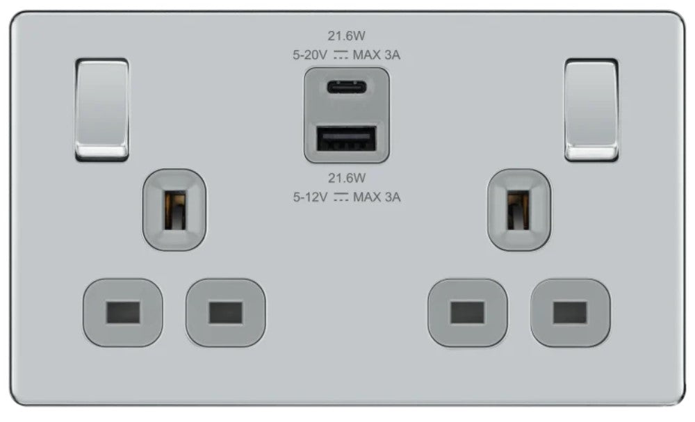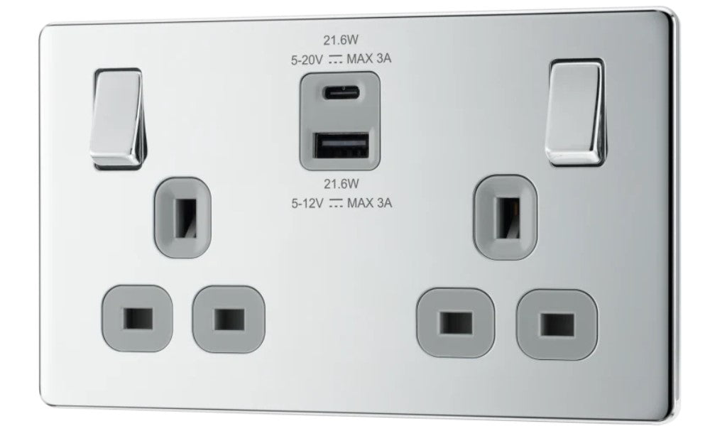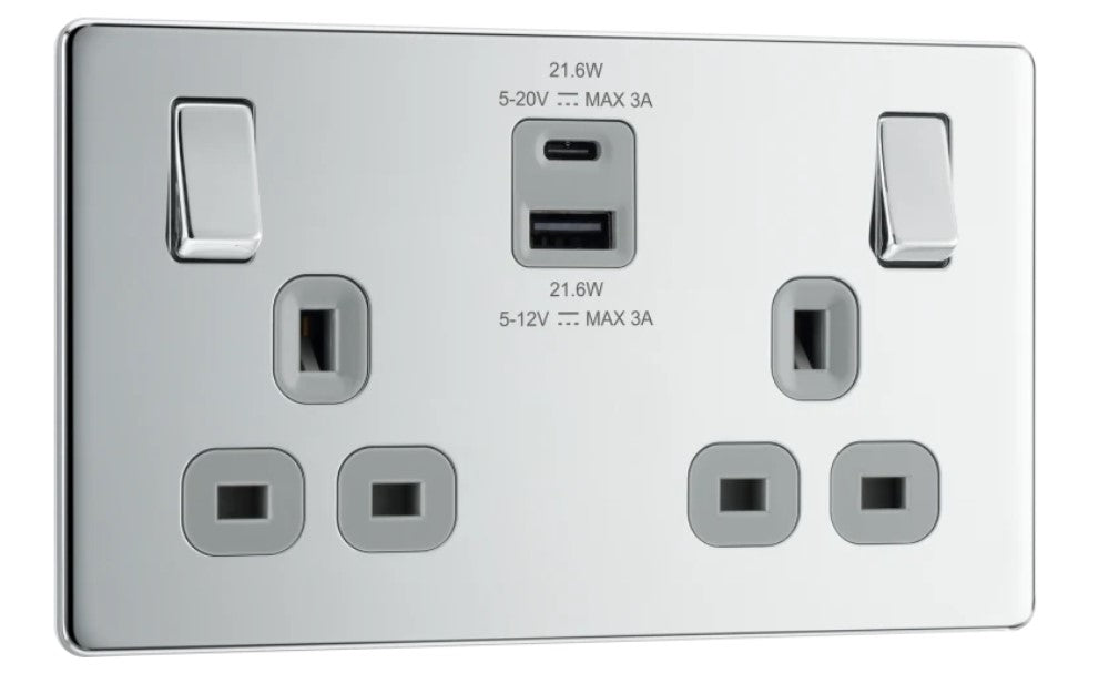 BG Screwless Polished Chrome 13A Double USB 22W Socket A&C Ports FPC22UAC22G