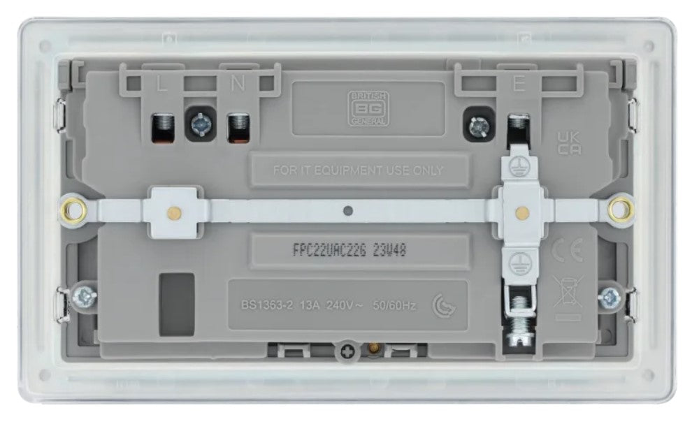 The FPC22UAC22G is a 13A double USB socket with a 22W fast charge A+C port from the BG Screwless range, finished in polished chrome with grey inserts. The 22 Watt variable voltage fast charging supports PD & QC charging protocols for Android and iOS devices, and auto-detects the USB device and adjusts the charging pattern to suit. With no visible screws on the decorative front plate, the collection also has a low profile, projecting 3mm from the wall. This range also comes with a full grid system to match.