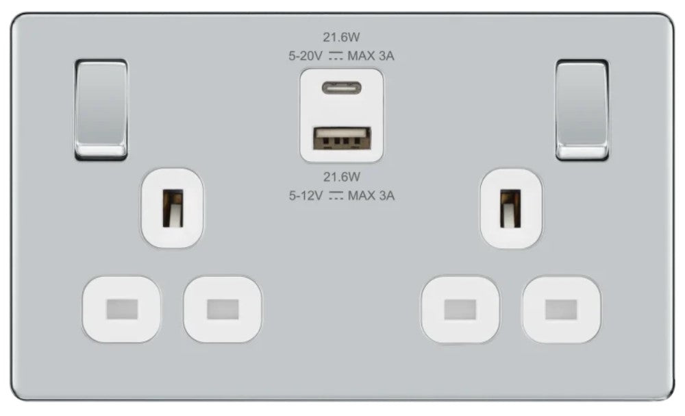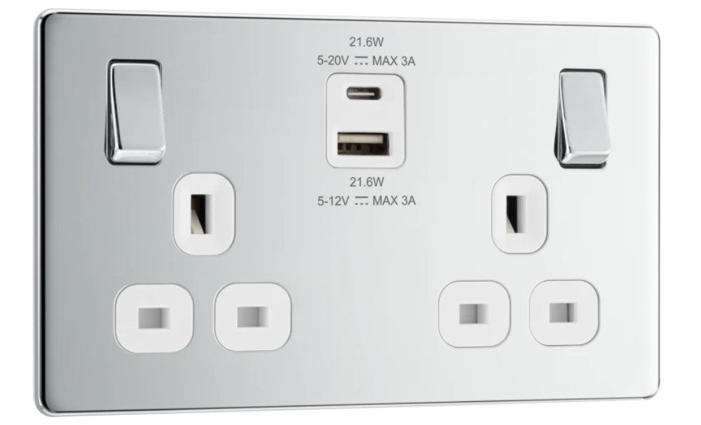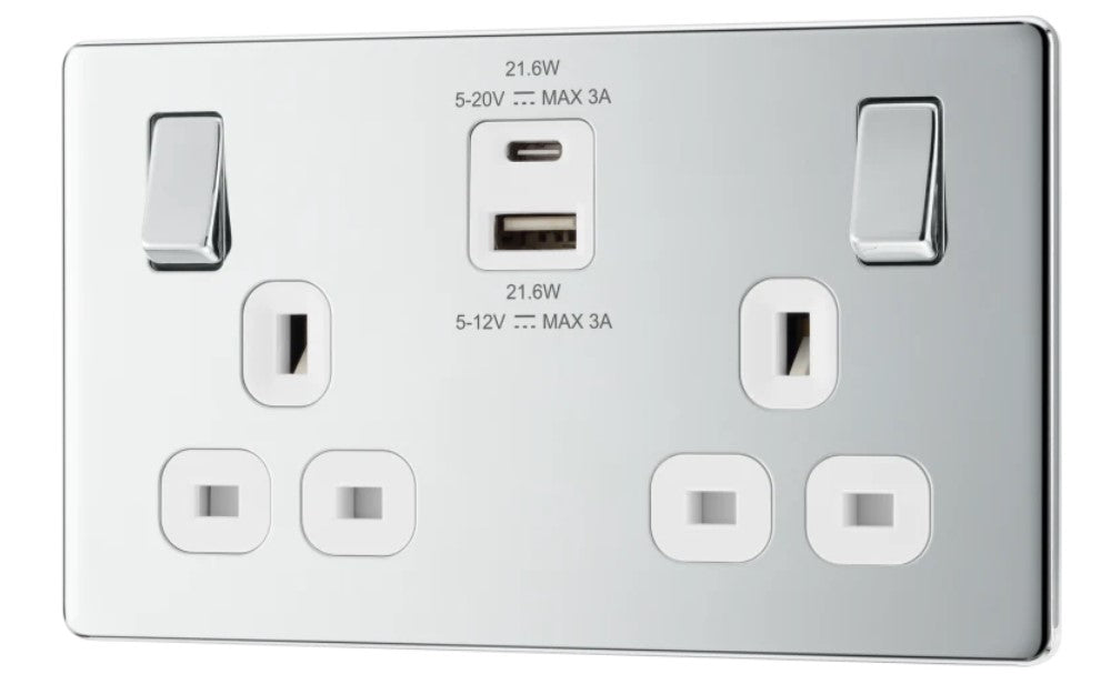 BG Screwless Polished Chrome 13A Double USB 22W Socket A&C Ports FPC22UAC22W