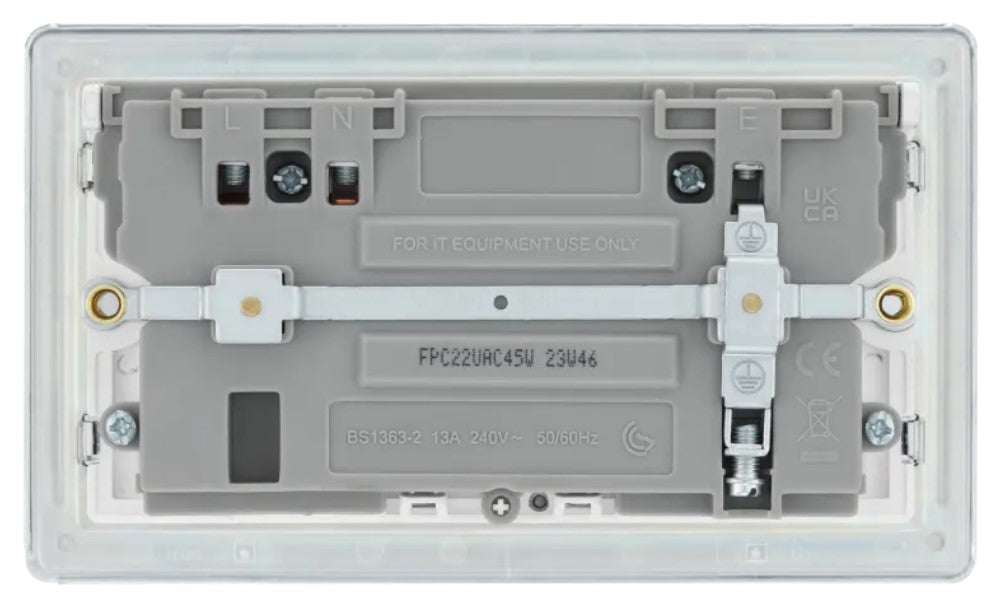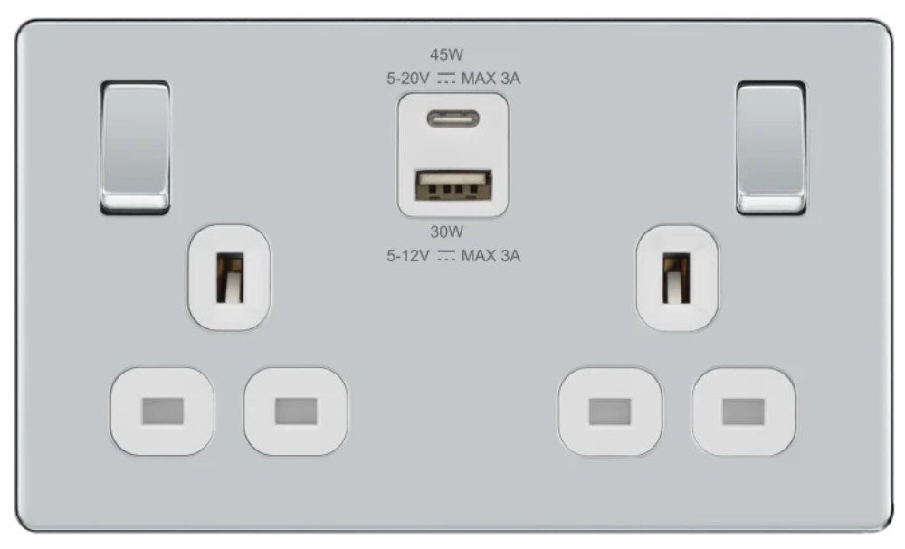 The FPC22UAC45W is a 13A double USB socket with a 45W fast charge A+C port from the BG Screwless range, finished in polished chrome with white inserts. The 45 Watt variable voltage fast charging supports PD & QC charging protocols for Android and iOS devices, and auto-detects the USB device and adjusts the charging pattern to suit. With no visible screws on the decorative front plate, the collection also has a low profile, projecting 3mm from the wall. This range also comes with a full grid system to match.