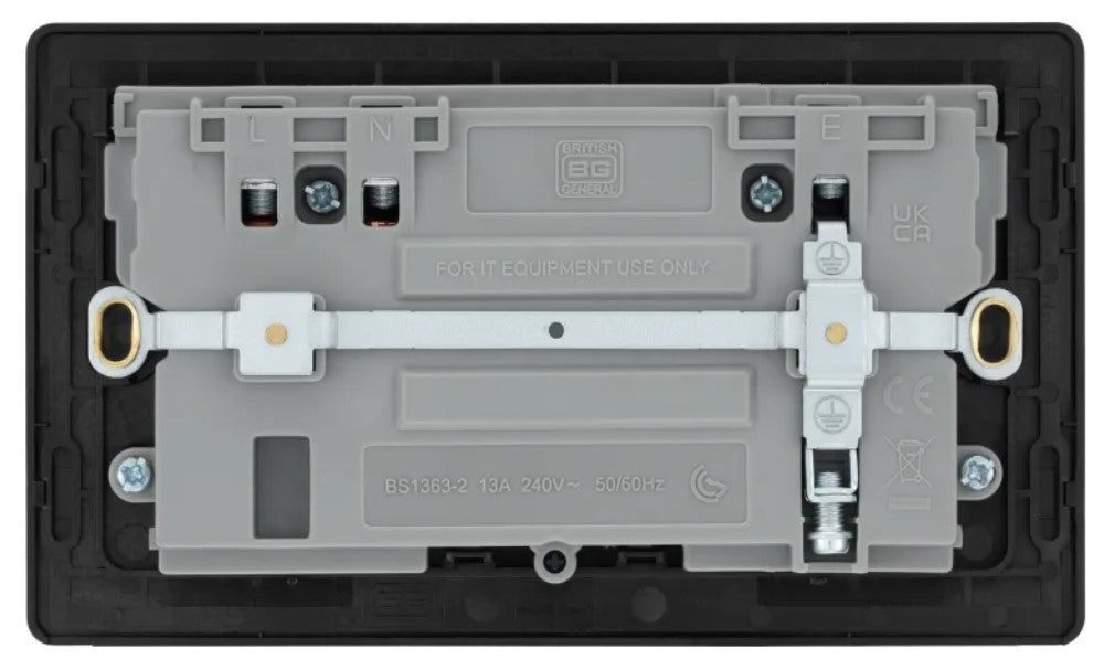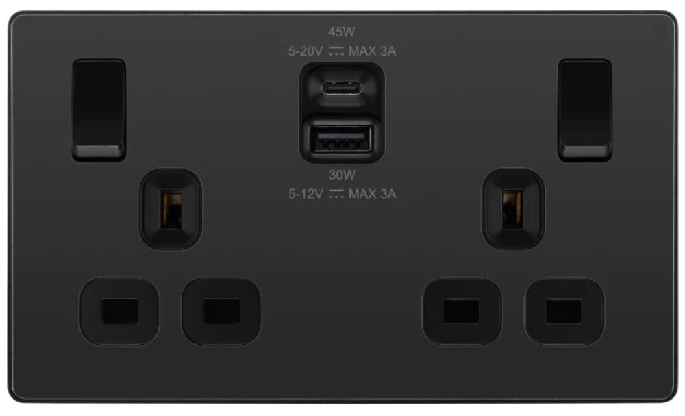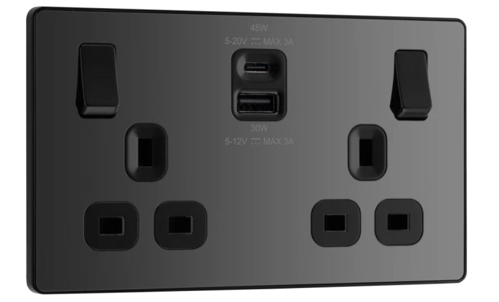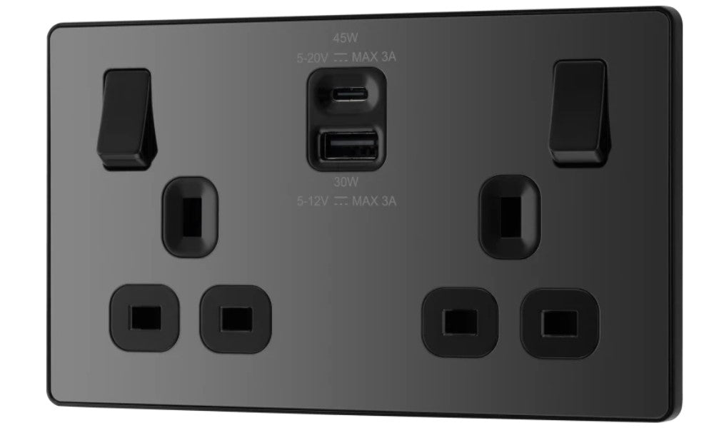 The PCDBC22UAC45B is a 13A double USB socket with 45W A+C ports from the BG Evolve range, finished in black chrome. The newest decorative collection from BG, the Evolve range is constructed from a lightweight, polycarbonate material, with a slim profile and a contrast edging.