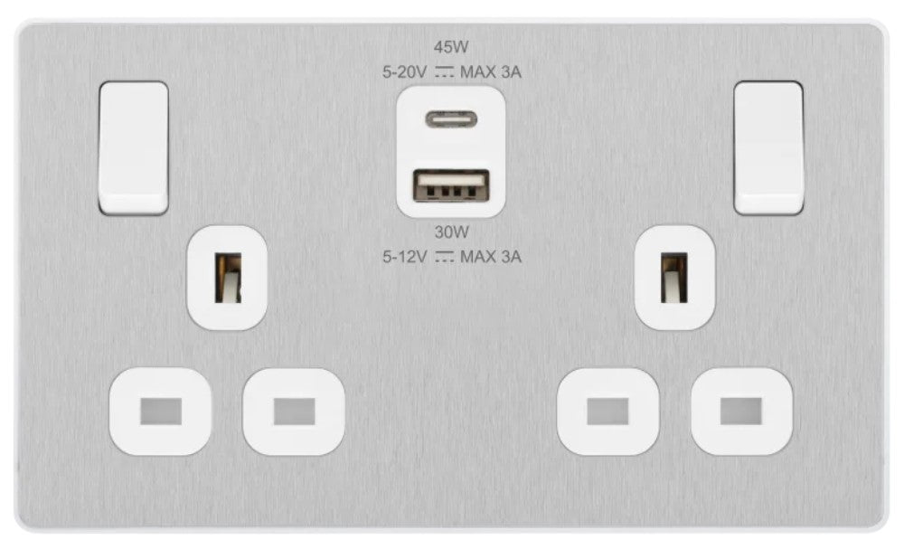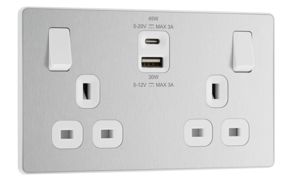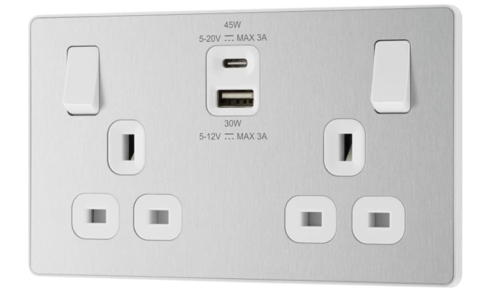 The PCDBS22UAC45W is a 13A double USB socket with 45W A+C ports from the BG Evolve range, finished in brushed steel. The newest decorative collection from BG, the Evolve range is constructed from a lightweight, polycarbonate material, with a slim profile and a contrast edging.