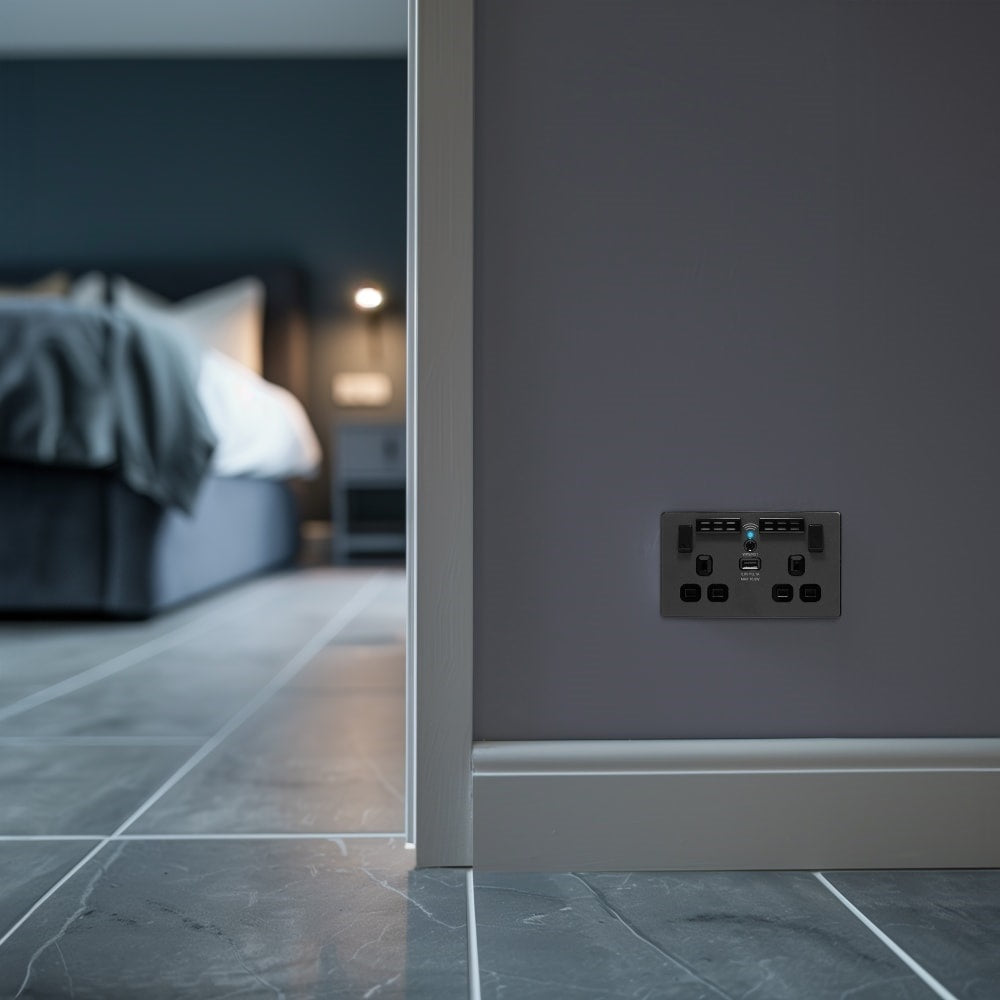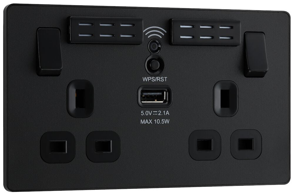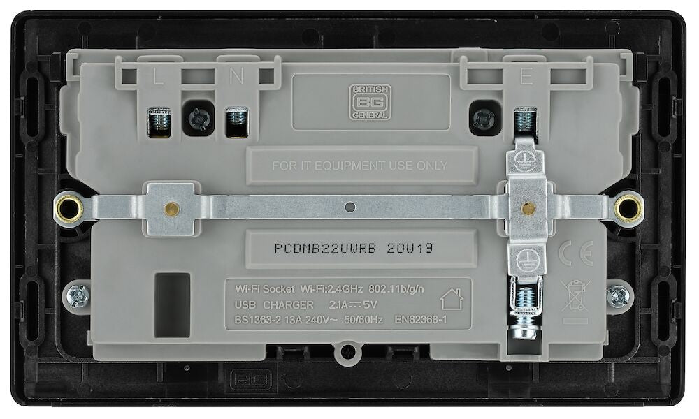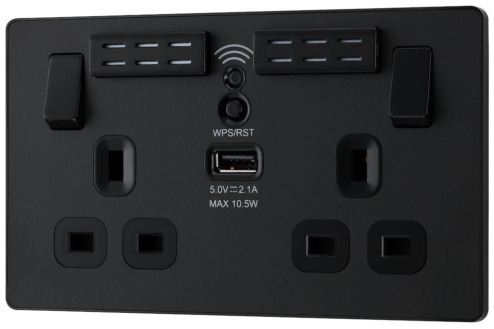 The PCDMB22UWRB is a wi-fi extender USB socket from the BG Evolve range, finished in matt black. The newest decorative collection from BG, the Evolve range is constructed from a lightweight, polycarbonate material, with a slim profile and a contrast edging.