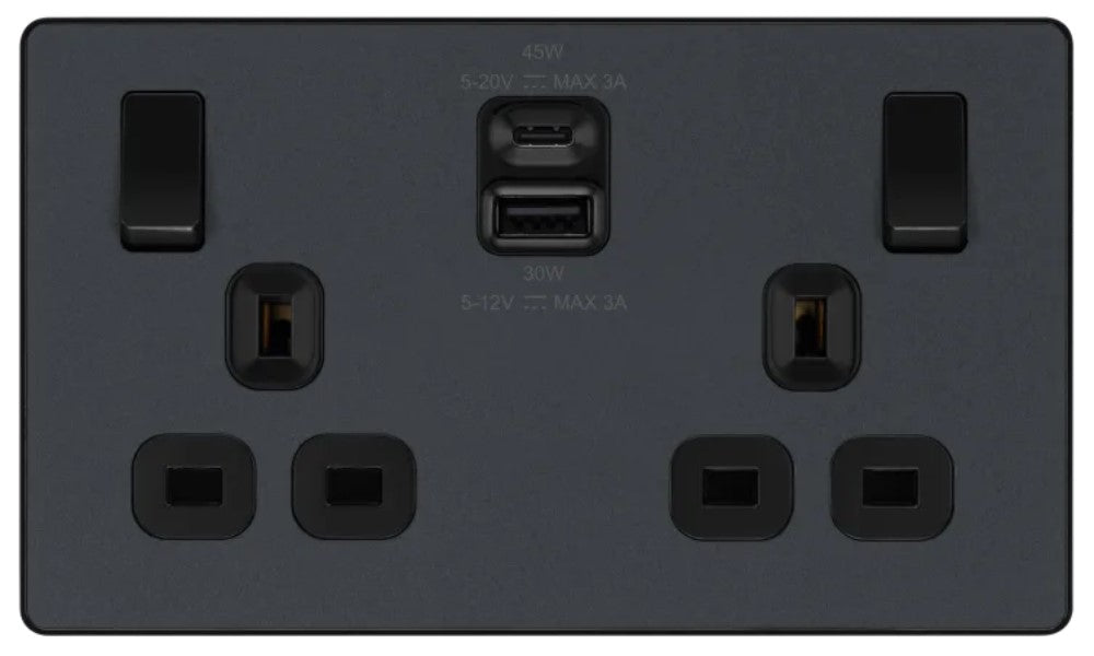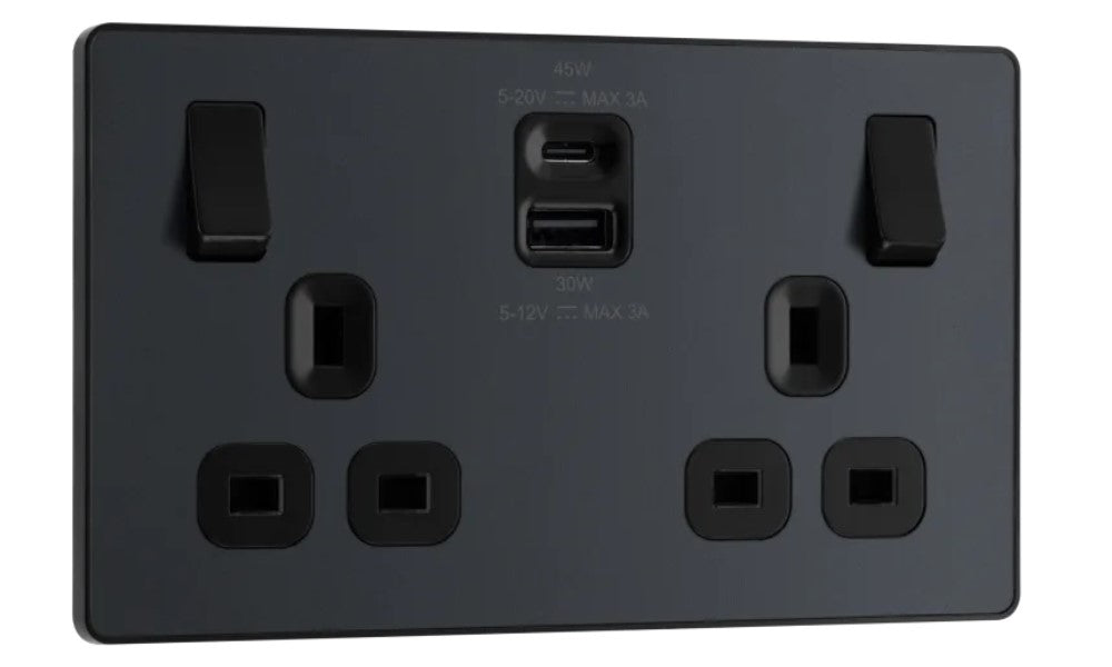 The PCDMG22UAC45B is a 13A double USB socket with 45W A+C ports from the BG Evolve range, finished in matt grey. The newest decorative collection from BG, the Evolve range is constructed from a lightweight, polycarbonate material, with a slim profile and a contrast edging.