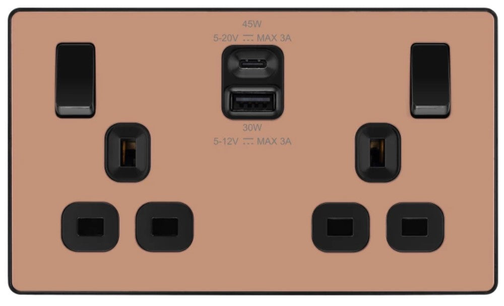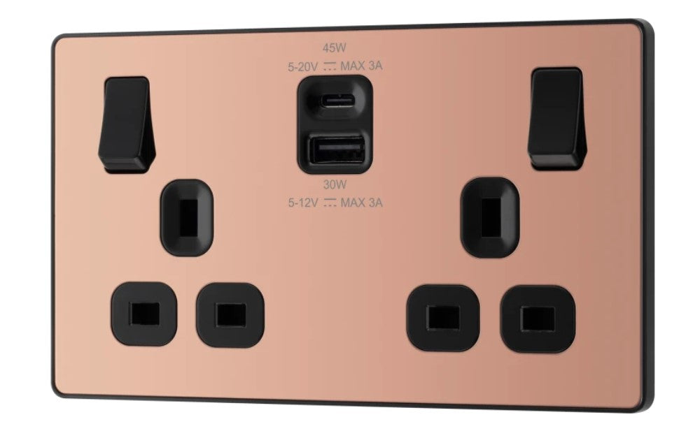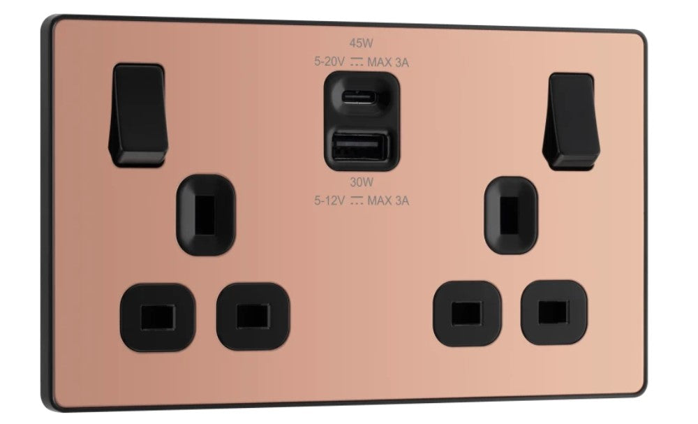The PCDCP22UAC45B is a 13A double USB socket with 45W A+C ports from the BG Evolve range, finished in polished copper. The newest decorative collection from BG, the Evolve range is constructed from a lightweight, polycarbonate material, with a slim profile and a contrast edging.