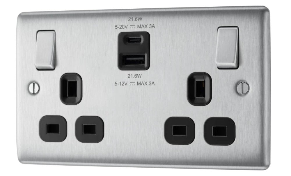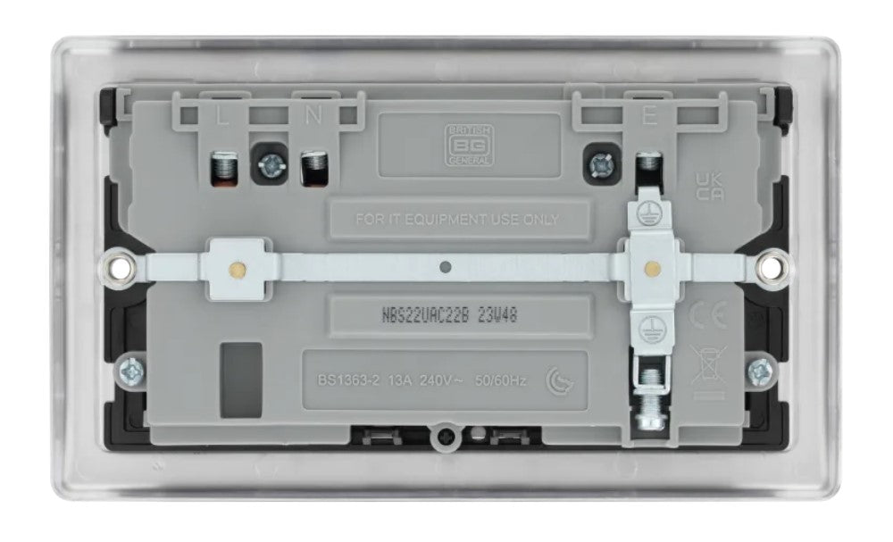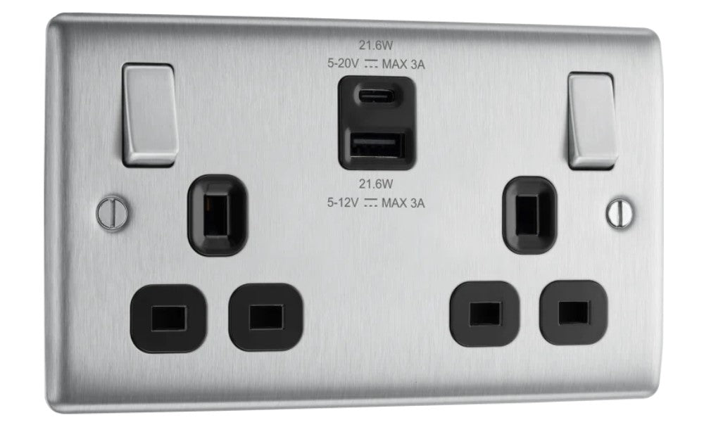 The NBS22UAC22B is a 13A double USB socket with 22W A+C ports. The 22 Watt variable voltage fast charging supports PD & QC charging protocols for Android and iOS devices, and auto-detects the USB device and adjusts the charging pattern to suit. This range of switches and sockets has been designed with a modern, slim profile and has a lightly lacquered surface to reduce fingerprint marks. The BG Nexus Metal range of switches and sockets comes with colour coded screws and has a full grid system to match.