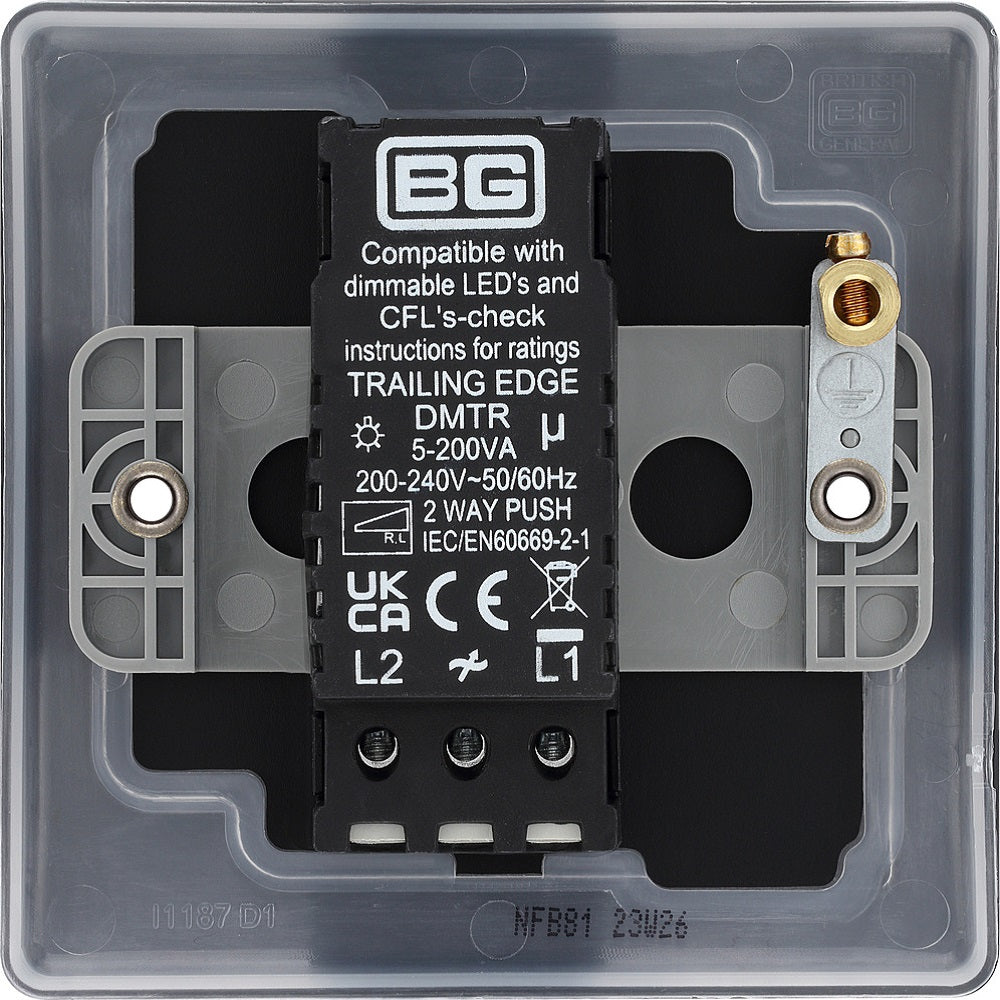 The NFB81 is a 1G dimmer switch from the Nexus Metal range from BG Electrical, finished in Matt Black. The nexus range of switches and sockets has been designed with a modern, slim profile and has a lightly lacquered surface to reduce fingerprint marks.