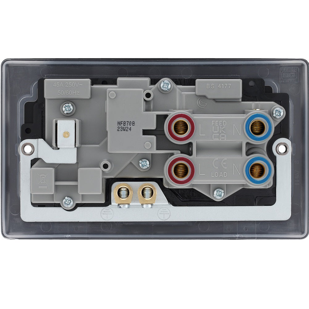 The NFB70B is a 45A cooker unit with double pole switch and neon from the Nexus Metal range from BG Electrical, finished in Matt Black with black inserts. The nexus range of switches and sockets has been designed with a modern, slim profile and has a lightly lacquered surface to reduce fingerprint marks.