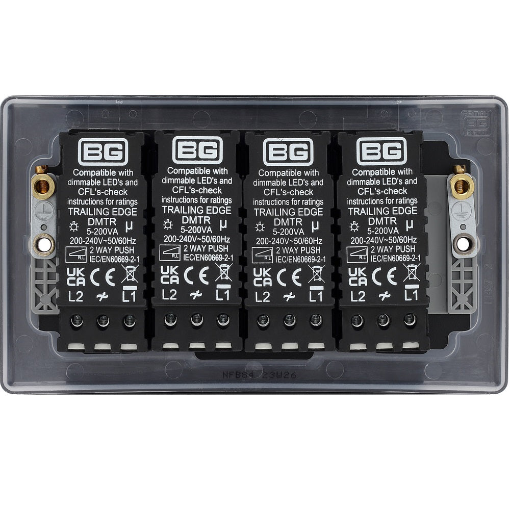 The NFB84 is a 4G dimmer switch from the Nexus Metal range from BG Electrical, finished in Matt Black and built using BG Nexus Grid system. The nexus range of switches and sockets has been designed with a modern, slim profile and has a lightly lacquered surface to reduce fingerprint marks.