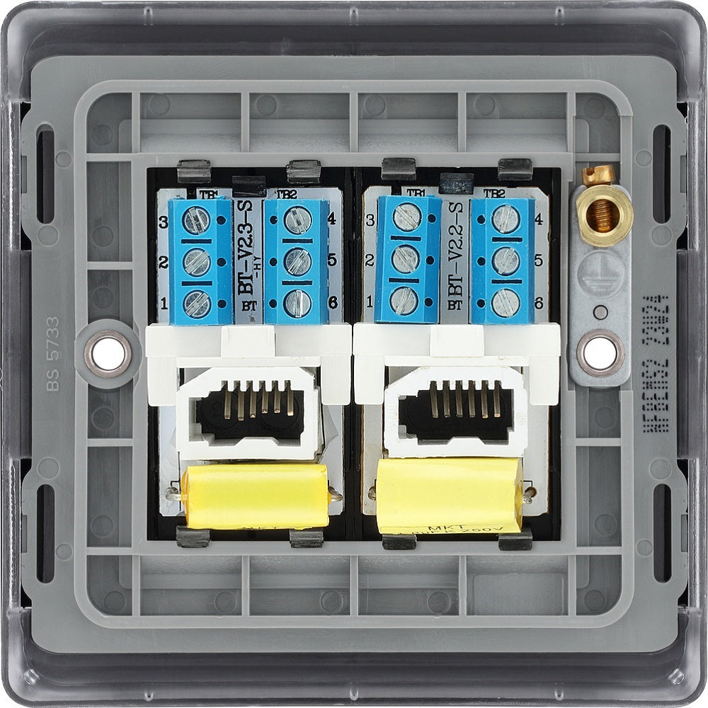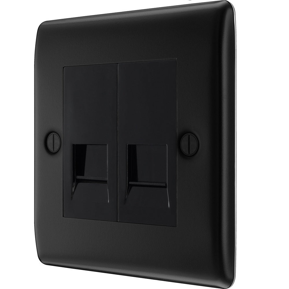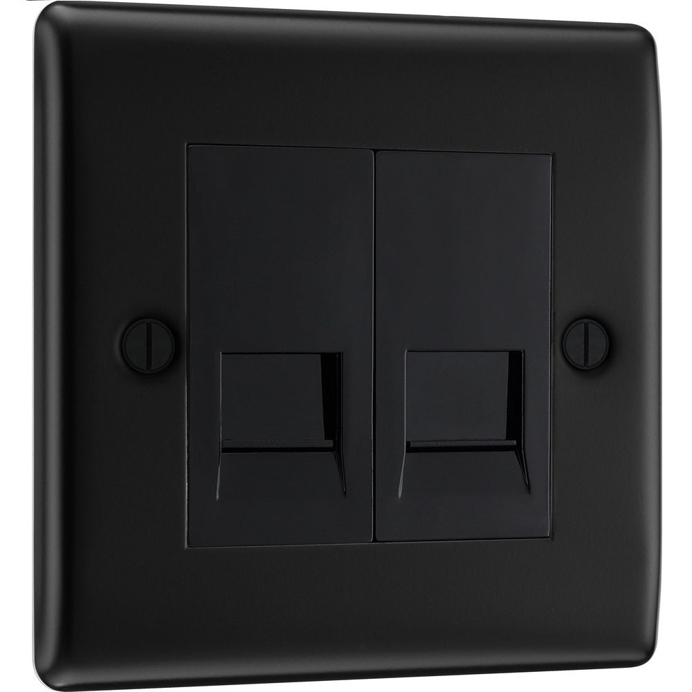 The NFBBTS2B is a double secondary telephone socket from the Nexus Metal range from BG Electrical, finished in Matt Black with black inserts and built using BG Euro Modular system. The nexus range of switches and sockets has been designed with a modern, slim profile and has a lightly lacquered surface to reduce fingerprint marks.