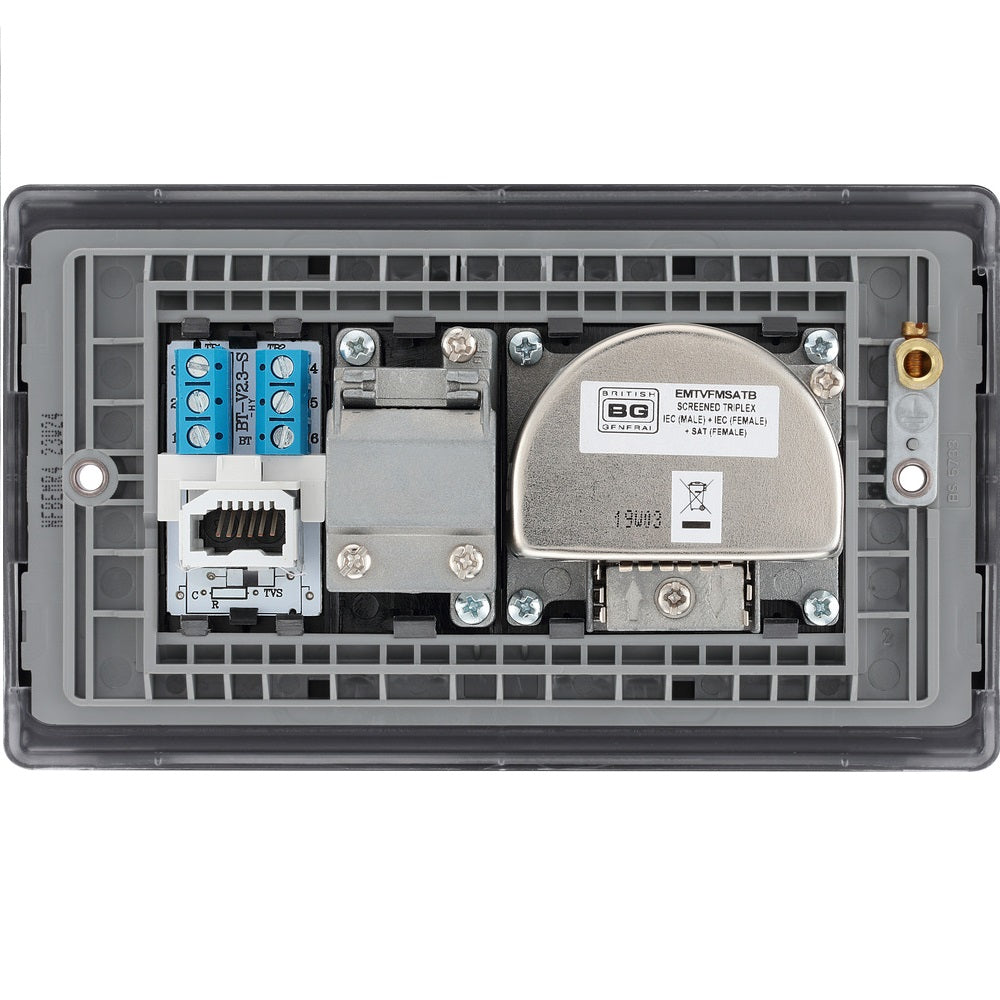 The NFB68B is a combination TV socket from the Nexus Metal range from BG Electrical, finished in Matt Black with black inserts and built using BG Euro Modular system. The nexus range of switches and sockets has been designed with a modern, slim profile and has a lightly lacquered surface to reduce fingerprint marks.