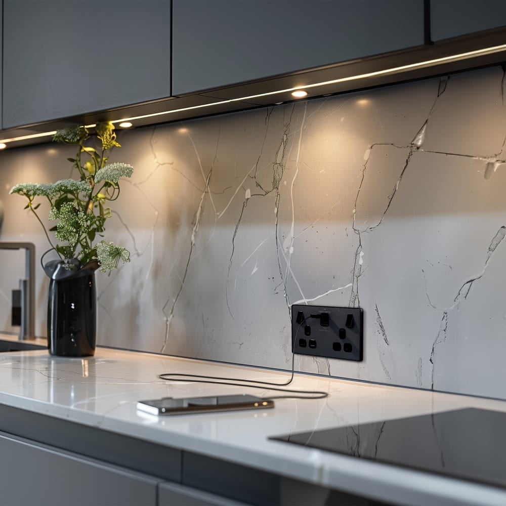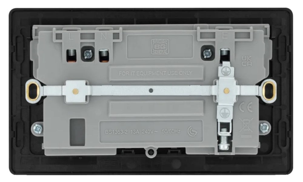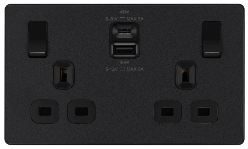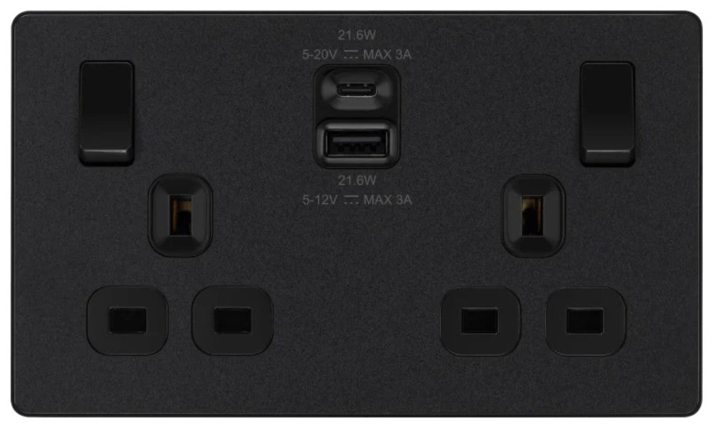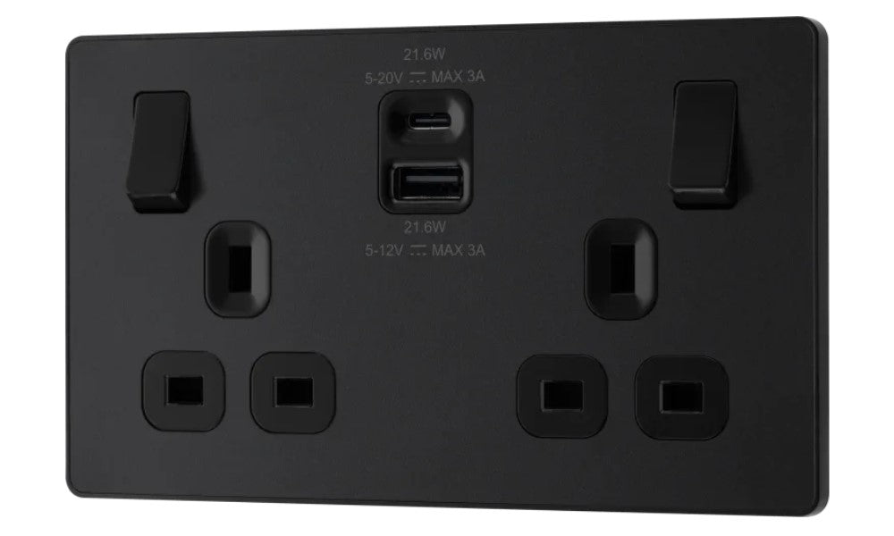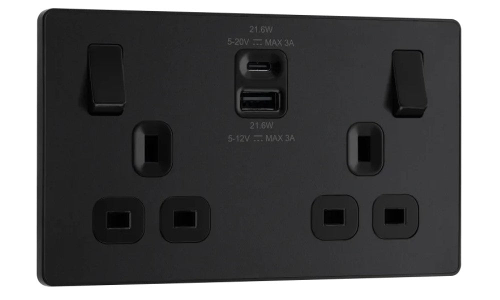 The PCDMB22UAC22B is a 13A double USB socket with 22W A+C ports from the BG Evolve range, finished in matt black. The newest decorative collection from BG, the Evolve range is constructed from a lightweight, polycarbonate material, with a slim profile and a contrast edging.