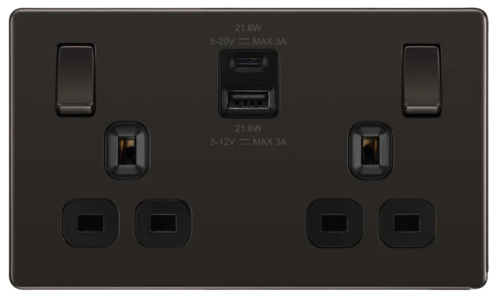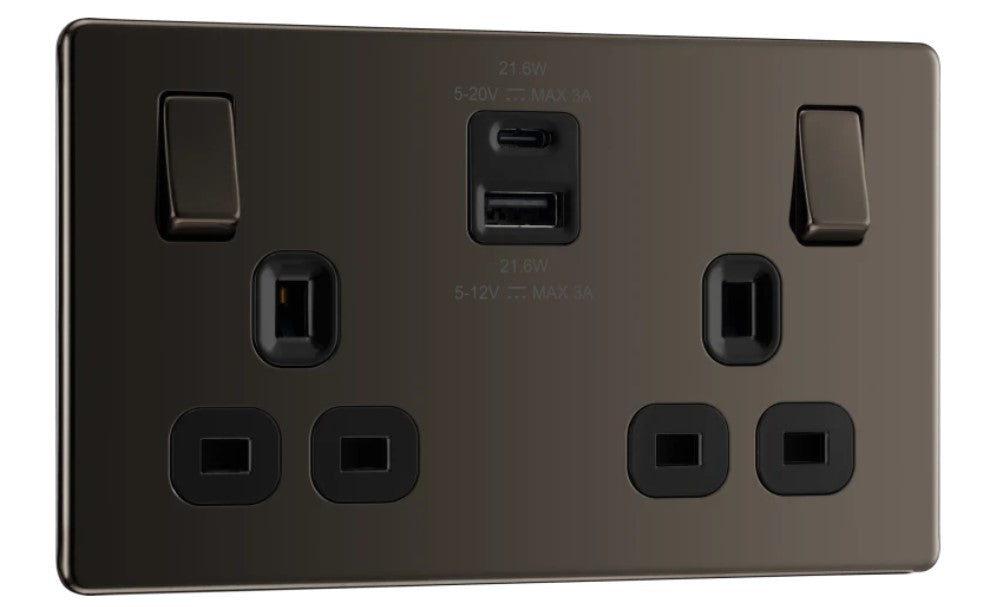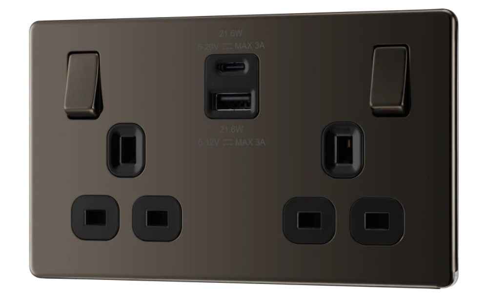 BG Screwless Black Nickel 13A Double USB 22W A+C Ports FBN22UAC22B