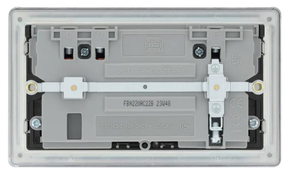 The FBN22UAC22B is a 13A double USB socket with a 22W fast charge A+C port from the BG Screwless range, finished in black nickel with black inserts. The 22 Watt variable voltage fast charging supports PD & QC charging protocols for Android and iOS devices, and auto-detects the USB device and adjusts the charging pattern to suit. With no visible screws on the decorative front plate, the collection also has a low profile, projecting 3mm from the wall. This range also comes with a full grid system to match.