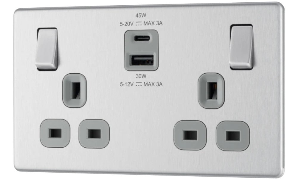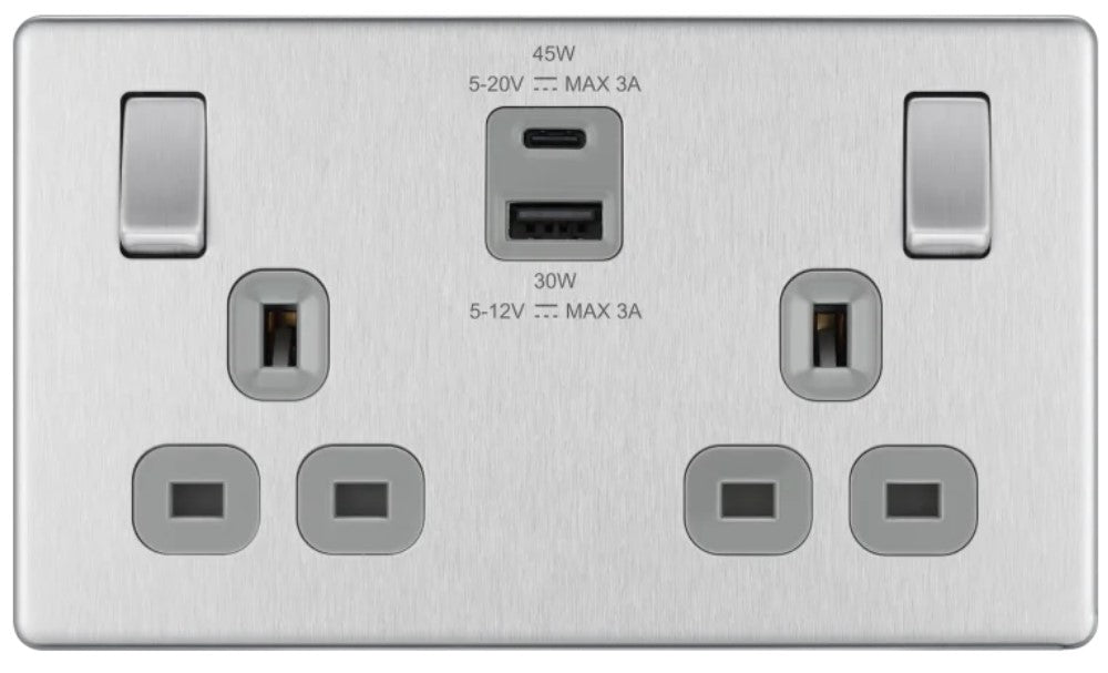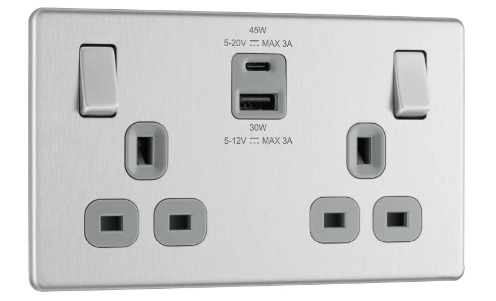 BG Screwless Brushed Steel 13A Double USB 45W A+C Ports FBS22UAC45G