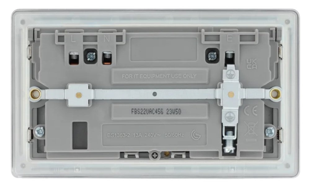 The FBS22UAC45G is a 13A double USB socket with a 45W fast charge A+C port. The 45 Watt variable voltage fast charging supports PD & QC charging protocols for Android and iOS devices, and auto-detects the USB device and adjusts the charging pattern to suit. With no visible screws on the decorative front plate, the collection also has a low profile, projecting 3mm from the wall. This range also comes with a full grid system to match.