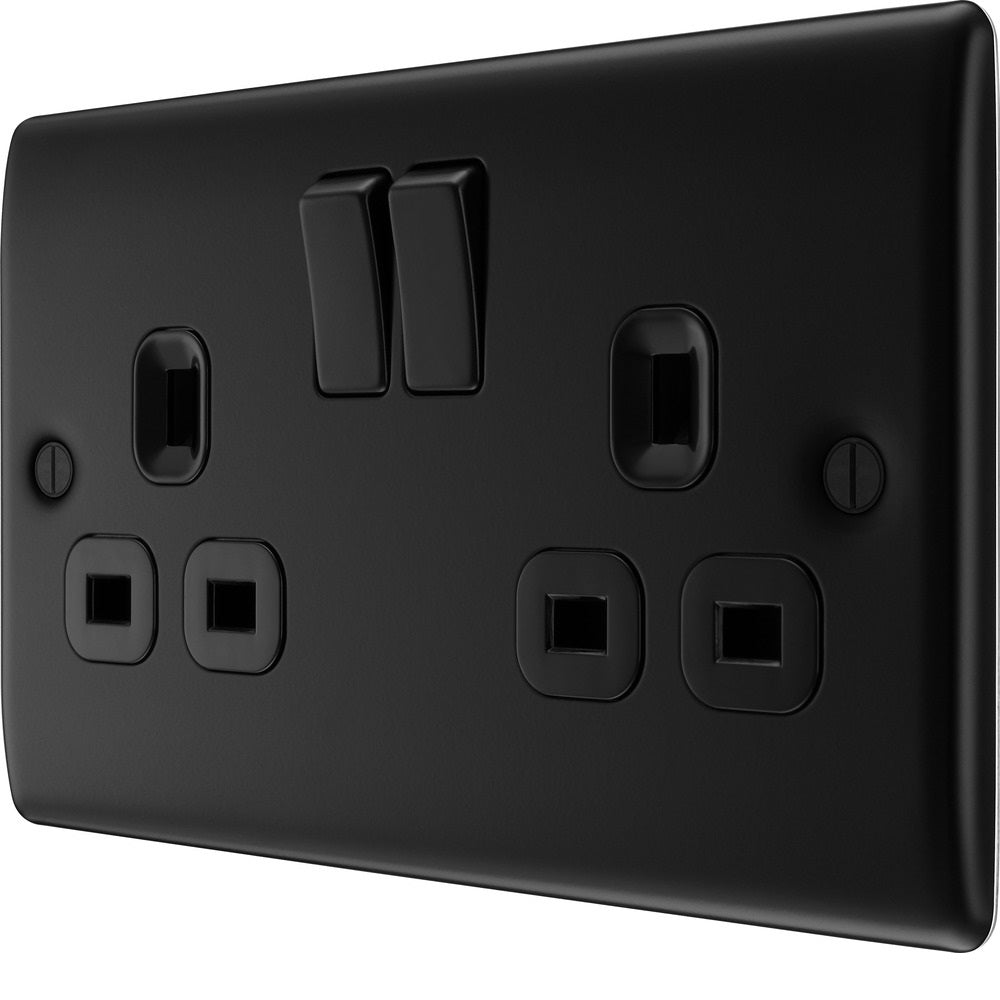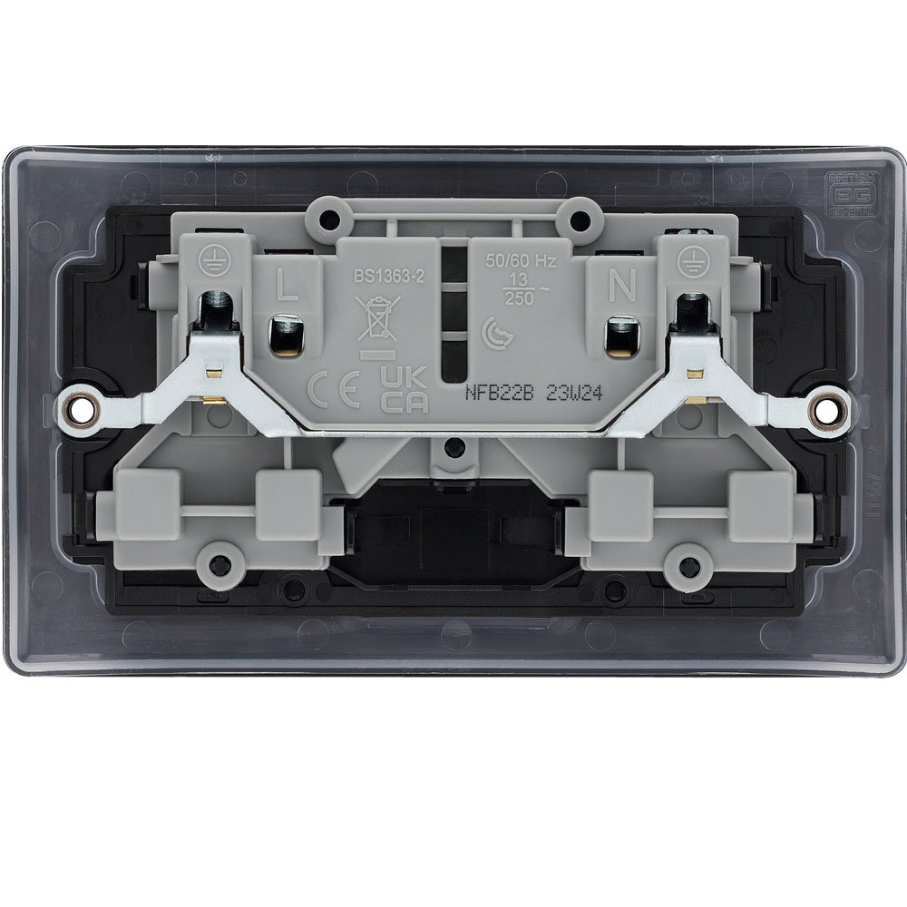 The NFB22B is a 13A double socket from the Nexus Metal range from BG Electrical, finished in Matt Black with black inserts. The nexus range of switches and sockets has been designed with a modern, slim profile and has a lightly lacquered surface to reduce fingerprint marks.