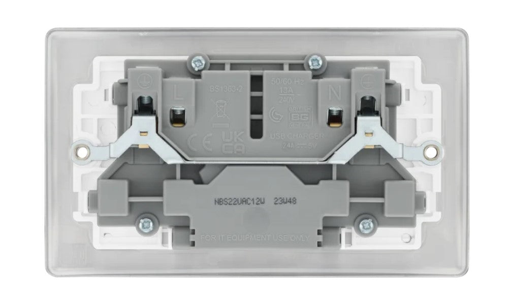 The NBS22UAC12W is a 13A double USB socket with 12W A+C ports. The 12 Watt variable voltage fast charging supports PD & QC charging protocols for Android and iOS devices, and auto-detects the USB device and adjusts the charging pattern to suit. This range of switches and sockets has been designed with a modern, slim profile and has a lightly lacquered surface to reduce fingerprint marks. The BG Nexus Metal range of switches and sockets comes with colour coded screws and has a full grid system to match.